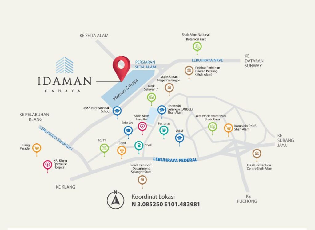 Selain daripada itu, Idaman Cahaya boleh akses ke Lembah Klang dan Shah Alam dengan mudah melalui Lebuhraya Persekutuan dan Lebuhraya Shapadu. Idaman Cahaya semestinya menjadi pilihan utama bagi keluarga yang mengimpikan kehidupan selesa dengan gaya hidup yang serba lengkap.